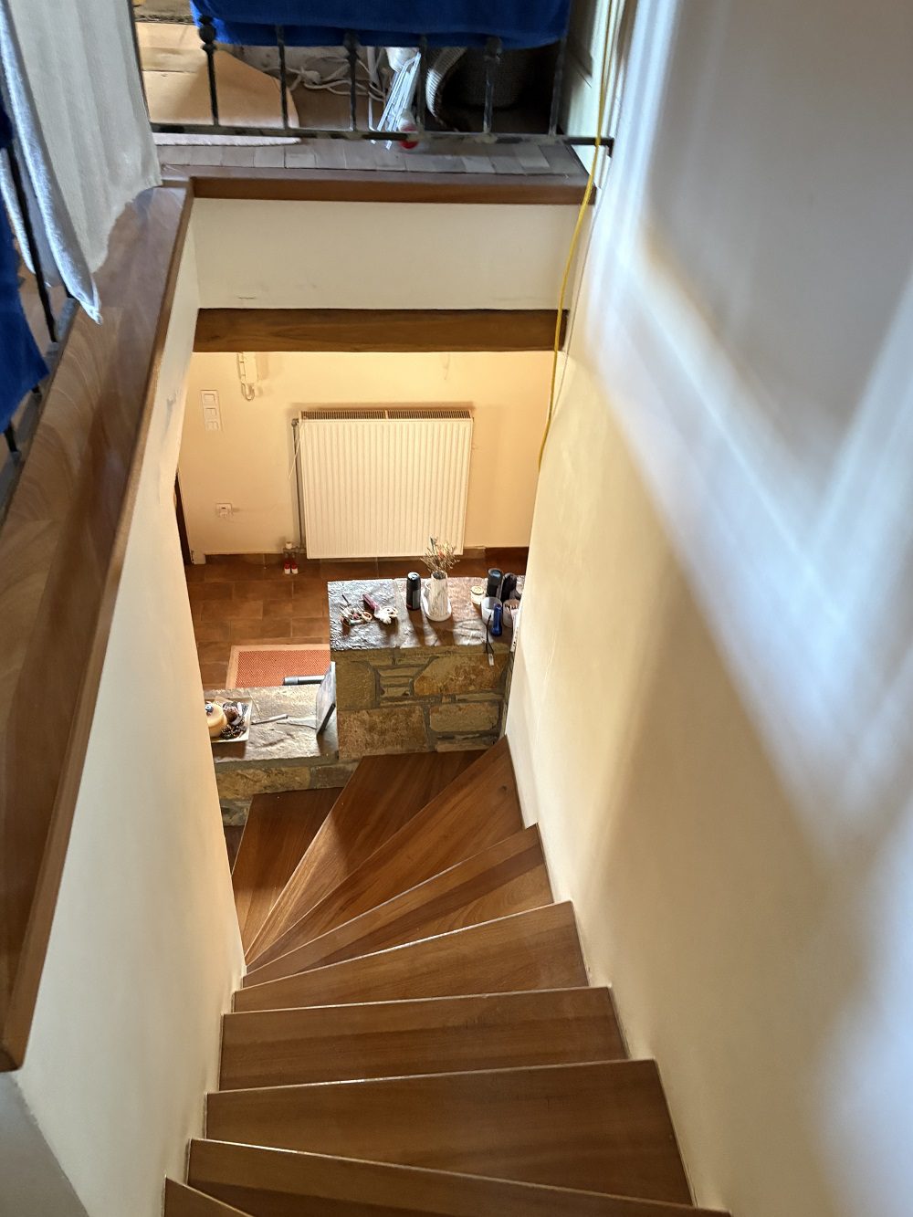 The upper floor features three bedrooms, two of which enjoy sea views and direct access to a balcony, as well as a family bathroom.